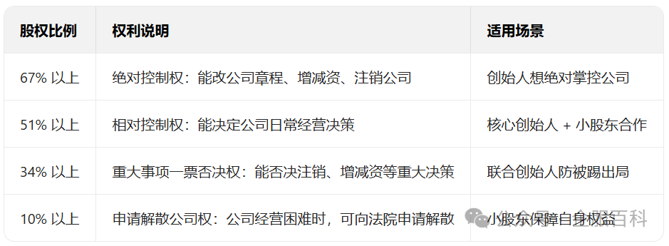股權比例是 “隱形炸彈”,很多合伙人創業時沒分好股權,后期因為決策權、分紅鬧掰。記住這 4 個關鍵比例,能避開 90% 的股權糾紛: